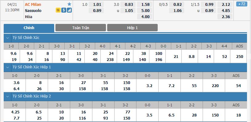 Bảng tỷ lệ kèo bóng đá AC Milan vs Sassuolo
