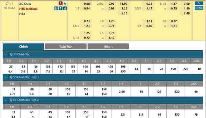 Bảng tỷ lệ kèo trực tuyến trận đấu AC Oulu vs HJK Helsinki: