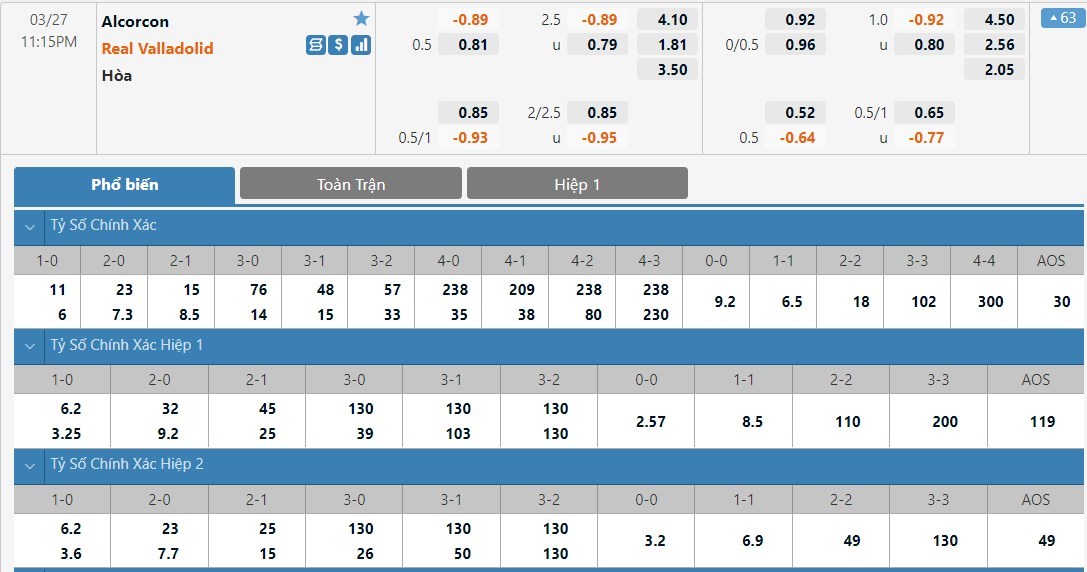 Bảng tỷ lệ kèo trực tuyến trận Alcorcon vs Valladolid:
