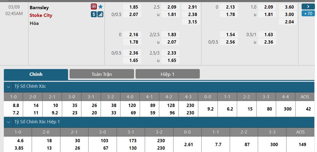 Bảng tỷ lệ kèo trực tuyến trận Barnsley vs Stoke City: