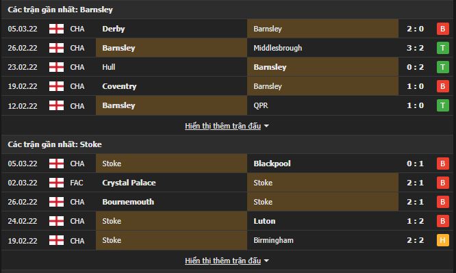 Phong độ gần đây Barnsley vs Stoke City: