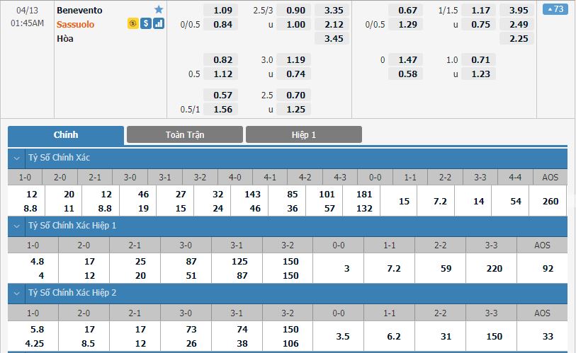 Bảng tỷ lệ kèo trực tuyến trận đấu Benevento vs Sassuolo