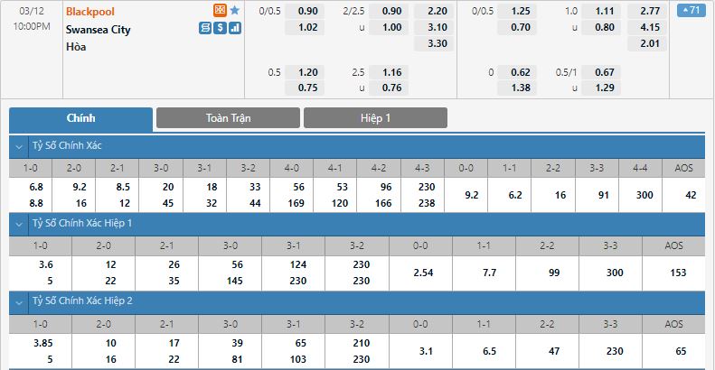Bảng tỷ lệ kèo bóng đá Blackpool vs Swansea