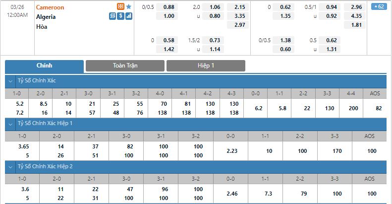 Bảng tỷ lệ kèo trực tuyến trận đấu Cameroon vs Algeria
