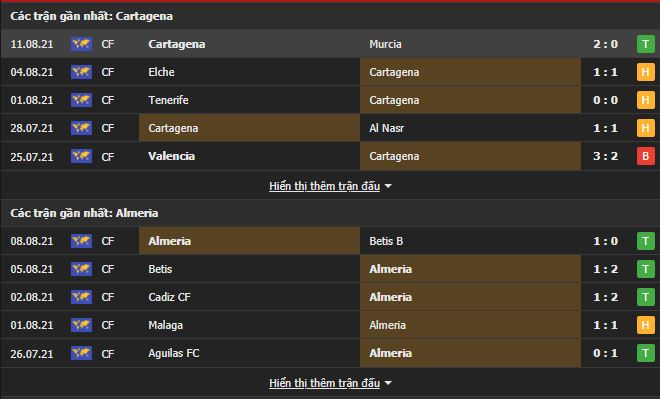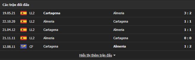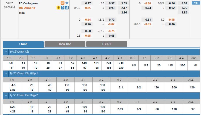 Bảng tỷ lệ kèo trực tuyến trận đấu Cartagena vs Almeria: