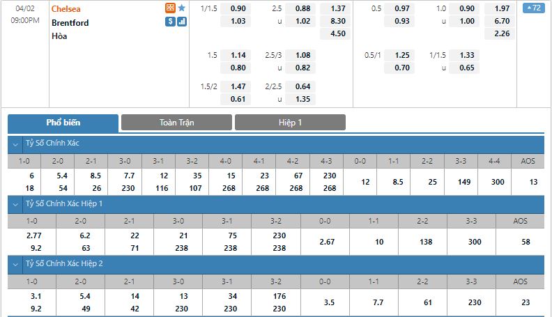 Bảng tỷ lệ kèo bóng đá Chelsea vs Brentford