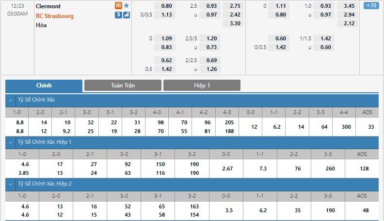 - Kèo tỉ số hiệp 1: Clermont 0-0 Strasbourg