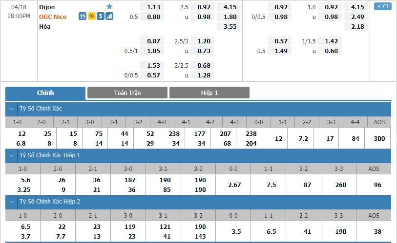 Bảng tỷ lệ kèo bóng đá Dijon vs Nice