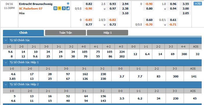 Bảng tỷ lệ kèo trực tuyến trận đấu Eintracht Braunschweig vs Paderborn 07: