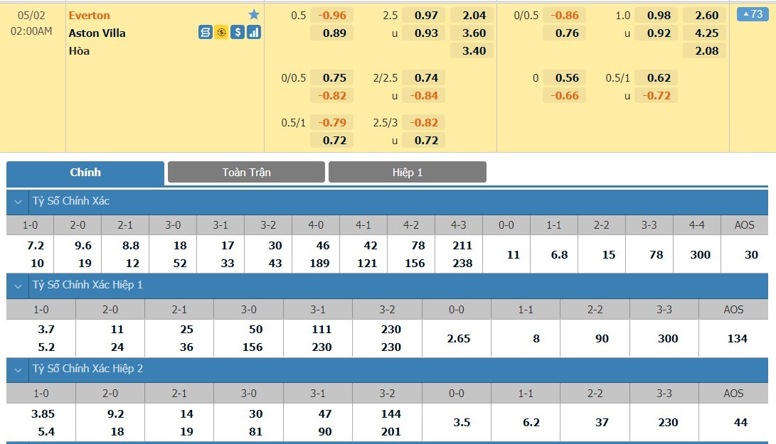 Bảng tỷ lệ kèo trực tuyến trận đấu Everton vs Aston Villa: