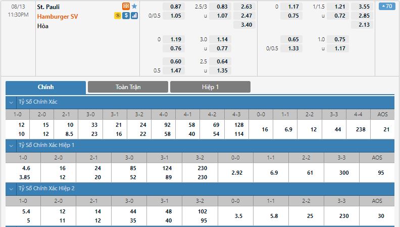 Bảng tỷ lệ kèo bóng đá FC St. Pauli vs Hamburger SV