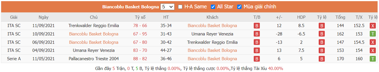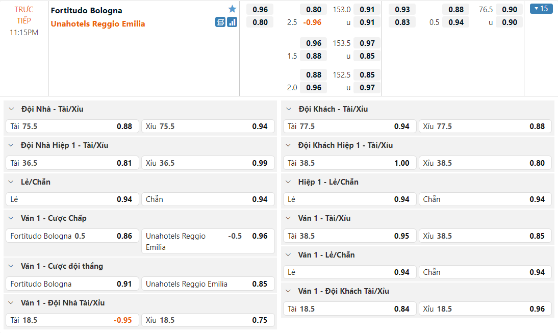 Bảng tỷ lệ kèo Fortitudo Bologna vs UNAhotels Reggio Emilia