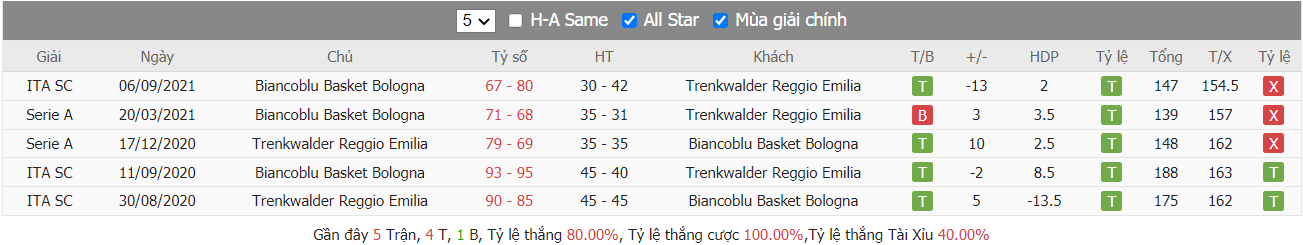 Thống kê cho thấy đội chủ nhà UNAhotels Reggio Emilia hiện vẫn đang duy trì được phong độ khá phóng khoáng trong thời gian qua khi mà trung bình mỗi trận trong tổng số 4 trận đón khách được ra sân ngay trên sân nhà gần nhất UNAhotels Reggio Emilia đều đã ghi được trung bình tới 125 điểm mỗi trận và cũng đã để mất trung bình tới 119 điểm. Như vậy cửa tài vẫn được kỳ vọng hơn ở trận đấu tới khi mà thống kê cũng chỉ ra Fortitudo Bologna đều đã ghi được trên 123 điểm mỗi trận sau tổng số 4 trận đối đầu với chính UNAhotels Reggio Emilia gần nhất.