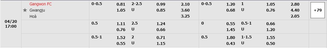 Bảng tỷ lệ kèo bóng đá Gangwon FC vs Gwangju FC