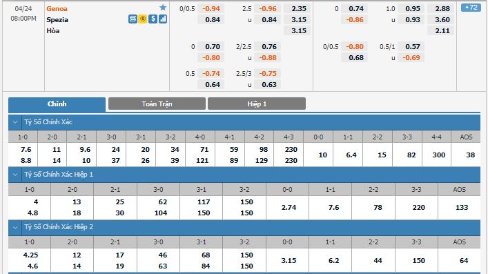 Bảng tỷ lệ kèo trực tuyến trận đấu Genoa vs Spezia: