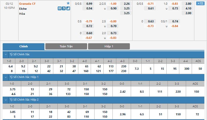 Bảng tỷ lệ kèo trực tuyến trận Granada CF vs Elche: