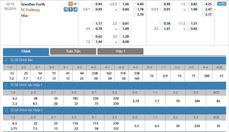Bảng tỷ lệ kèo bóng đá Greuther Furth vs SC Freiburg