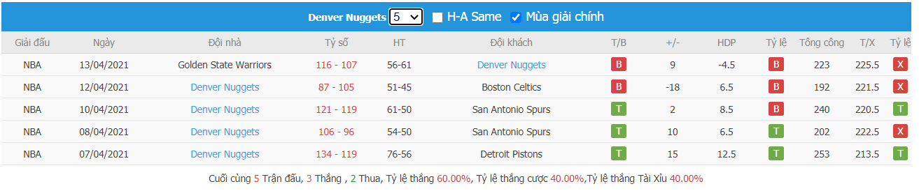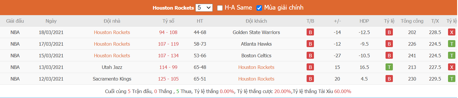 Thống kê về thành tích đối đầu của hai bên trong quá khứ cho thấy kể từ 04/2019 cho tới nay hai đội đã gặp nhau cả thảy 10 lần trong số đó có 4 trận diễn ra trên sân Toyota Center của Houston Rockets. Kết quả cho thấy dù tiếp tục có được lợi thế để được ra sân ngay trên sân nhà ở trận đấu tới nhưng Houston Rockets hoàn toàn không được đánh giá cao khi đã phải nhận tới 7 thất bại trên cả thảy 10 trận đối đầu với chính Denver Nuggets kể trên. Trong số đó ở lần gần nhất cặp đấu này diễn ra hồi 08/2020 khi đó Houston Rockets đã phải nhận thất bại 126 - 132 khi tiếp đón chính Denver Nuggets ngay trên sân nhà. Vậy nên Denver Nuggets hoàn toàn là sự lựa chọn sáng hơn ở kèo đấu này nhất là khi mà đội khách đang khởi sắc mạnh mẽ và đã toàn thắng về kèo theo TLCA trong 4 trận đã đấu gần nhất.