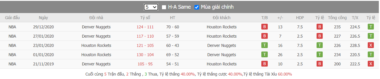Thành tích đối đầu Houston Rockets vs Denver Nuggets
