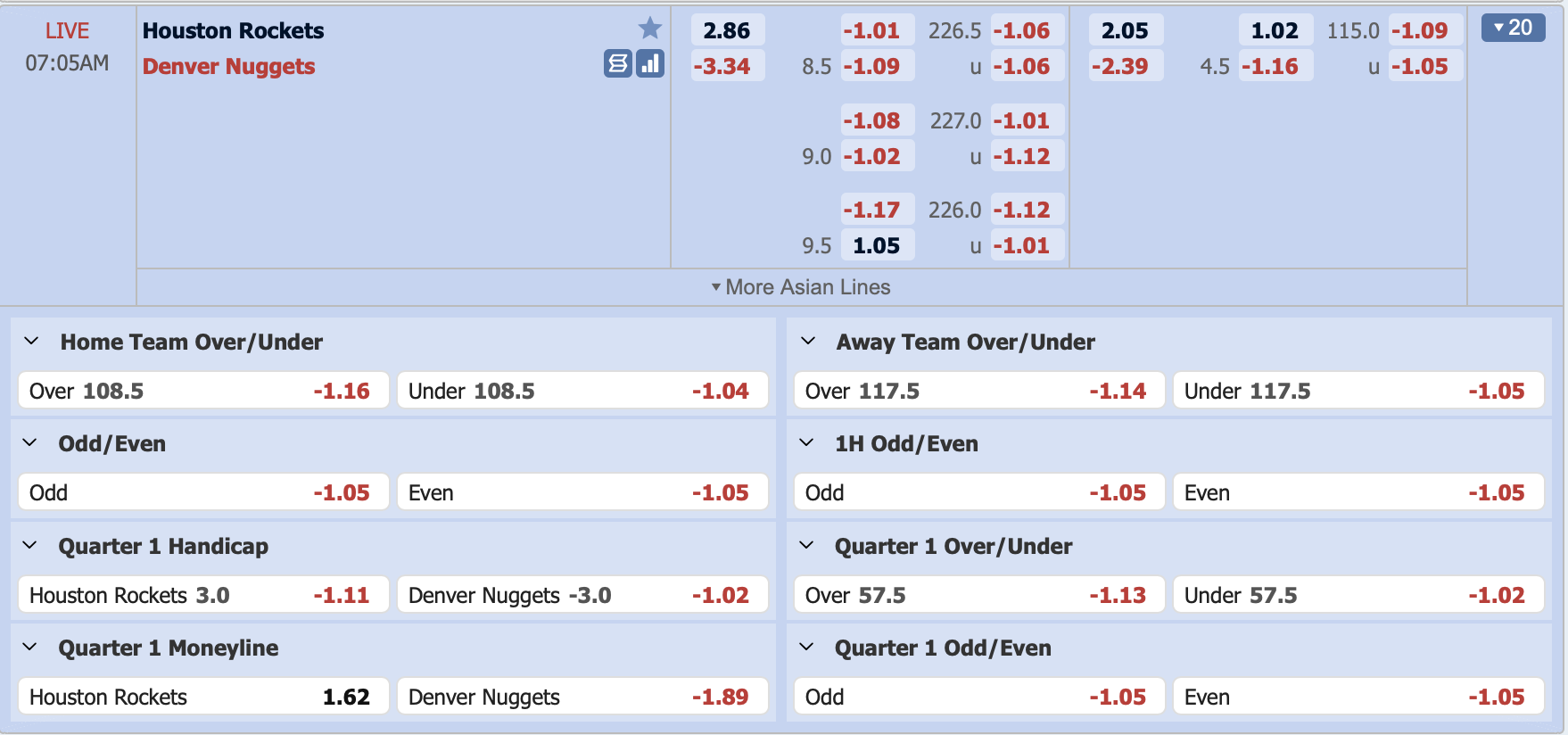 Bảng tỷ lệ kèo Houston Rockets vs Denver Nuggets