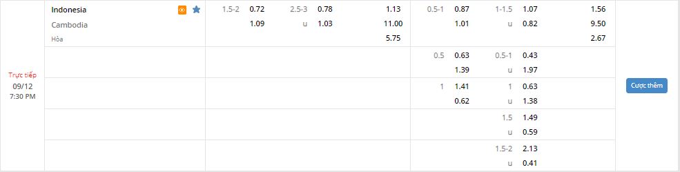 Bảng tỷ lệ kèo trực tuyến trận đấu Indonesia vs Campuchia