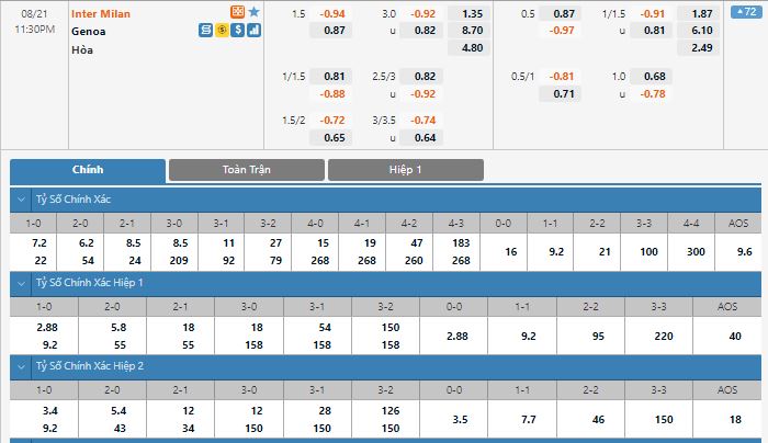 Bảng tỷ lệ kèo trực tuyến trận đấu Inter Milan vs Genoa: