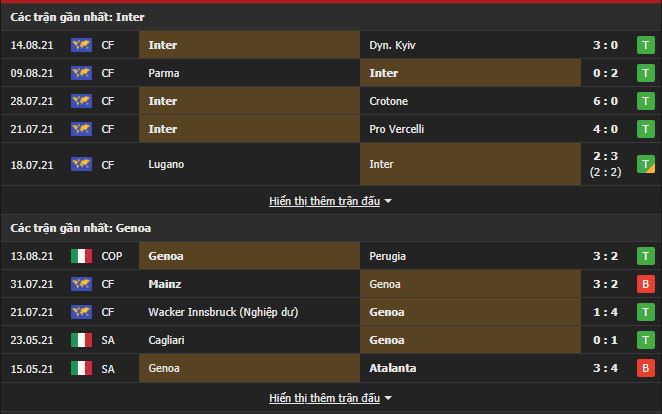 Phong độ gần đây Inter Milan vs Genoa: