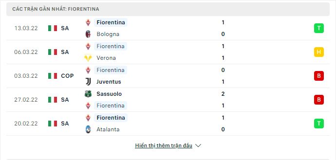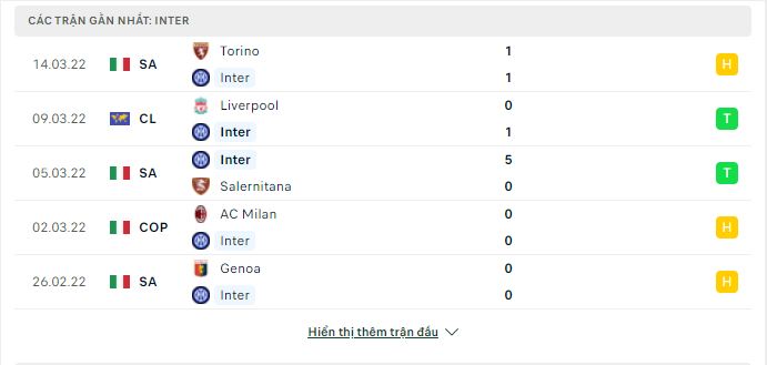 Thống kê phong độ gần đây Inter vs Fiorentina