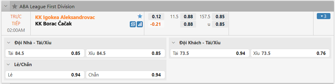 Bảng tỷ lệ kèo KK Igokea Aleksandrovac vs KK Borac Čačak