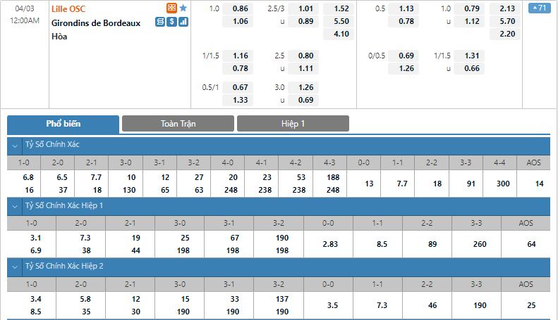 Bảng tỷ lệ kèo trực tuyến trận đấu Lille vs Bordeaux