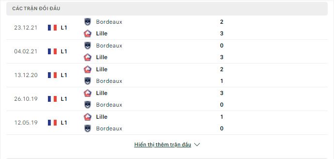 Thành tích đối đầu Lille vs Bordeaux
