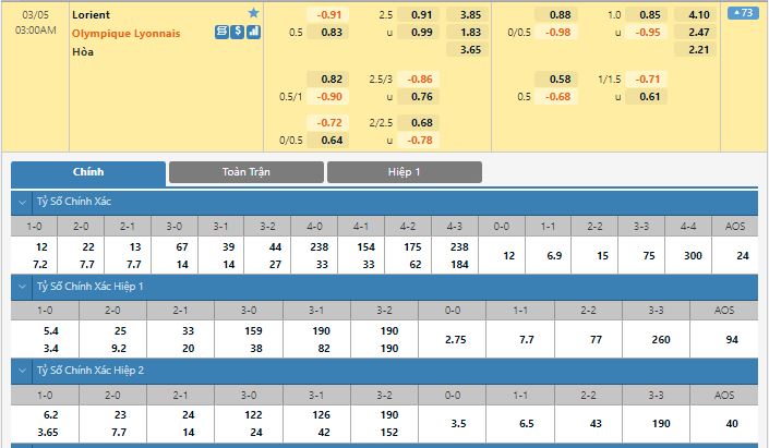 Bảng tỷ lệ kèo trực tuyến trận Lorient vs Lyon: