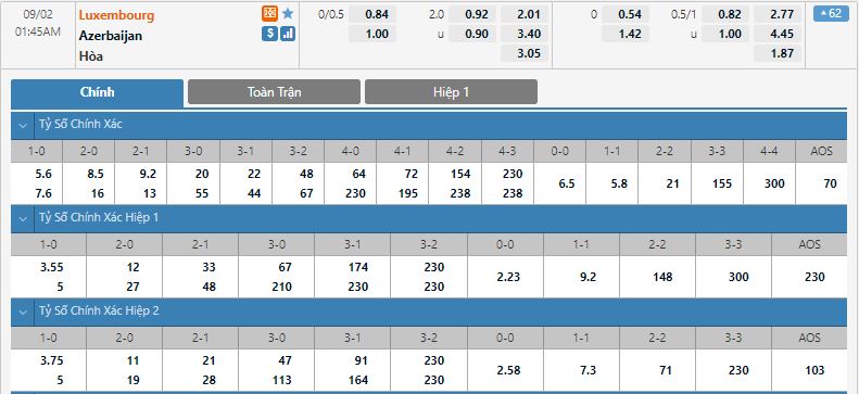 Sự chênh lệch của hai đội ở thời điểm hiện tại là đủ để quyết định lựa chọn một chiến thắng cho Luxembourg trên sàn giao dịch châu Âu. Những con số nhà cái đưa ra cho thấy cơ hội có điểm của thầy trò HLV Gianni De Biasi ở chuyến đi lần này đang nhận được khá nhiều nghi ngờ từ giới đầu tư. Nếu quyết định đầu tư ở kèo châu Âu, người chơi nên tin tưởng vào một chiến thắng cho đội chủ nhà.