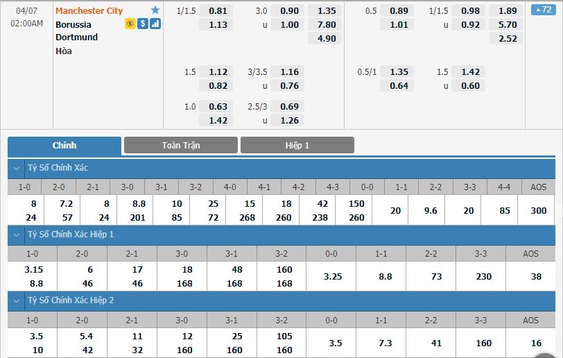 - Kèo tỉ số hiệp 1: Manchester City 1-0 Borussia Dortmund