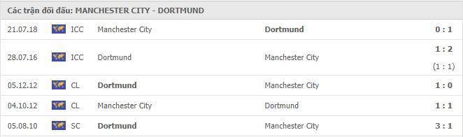Dù có lợi thế sân nhà cũng như phong độ thăng hoa trong thời gian gần đây nhưng lịch sử đang quay lưng lại với Manchester City. Thống kê cho thấy trong quá khứ The Citizens và Borussia Dortmund đã gặp nhau 5 lần và cán cân đang nghiêng hoàn toàn về người Đức với 3 chiến thắng cùng 2 trận hòa. Đây chắc chắn sẽ là yếu tố khiến đội bóng của Pep Guardiola phải tỏ ra dè chừng.