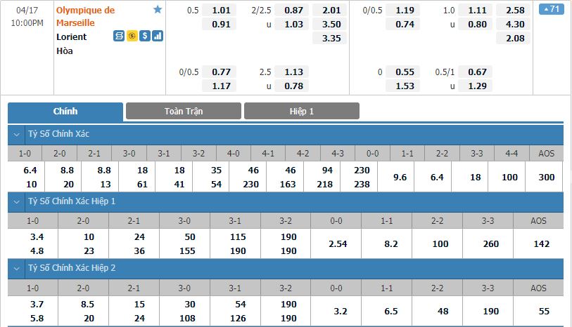 Bảng tỷ lệ kèo trực tuyến trận đấu Marseille vs Lorient