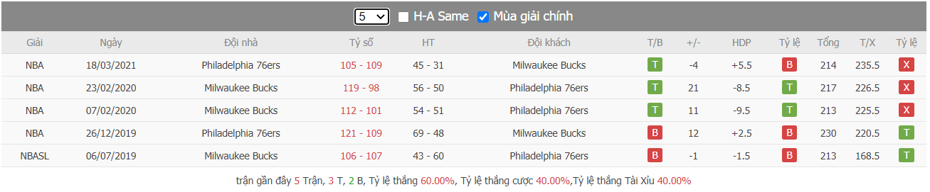 Thống kê về thành tích đối đầu của hai bên trong quá khứ, kết quả cho thấy đội chủ nhà đã toàn thua tới 5 trên tổng số 8 trận đối đầu của hai bên kể từ 04/2019 cho tới nay, trong đó có 4 trận diễn ra trên sân Fiserv Forum của chính Milwaukee Bucks. Vậy nên Philadelphia 76ers hoàn toàn là sự lựa chọn sáng hơn với giới đầu tư.