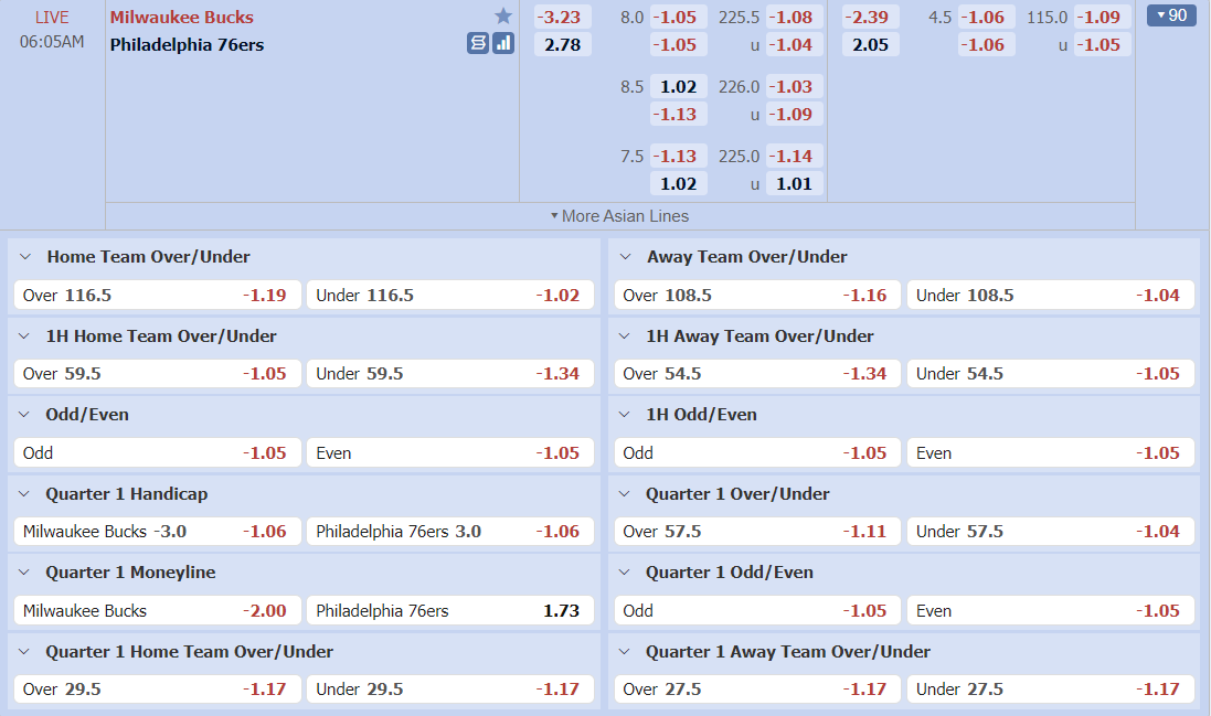 Bảng tỷ lệ kèo Milwaukee Bucks vs Philadelphia 76ers