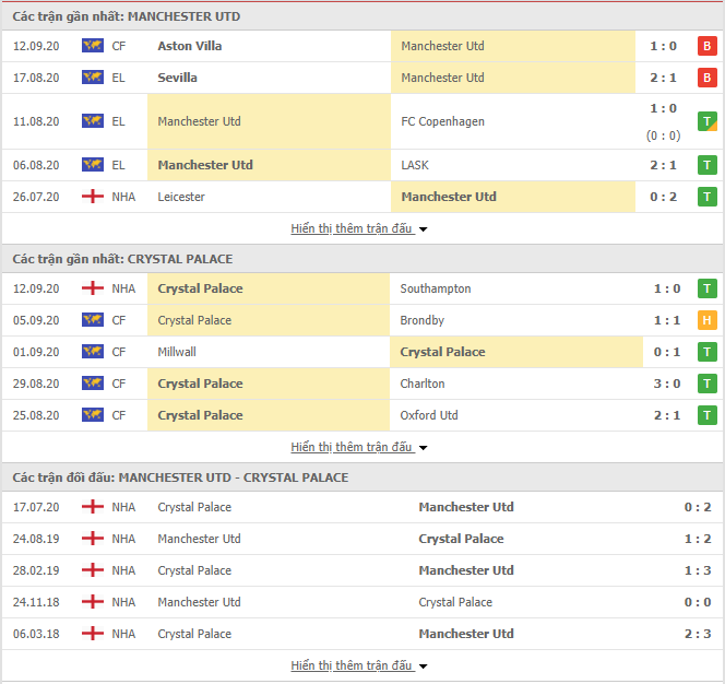 Lịch sử đang chống lại Crystal Palace khi ở 10 lần gặp nhau gần đây, các học trò của HLV Roy Hodgson chỉ có 1 chiến thắng, 2 trận hòa cùng 7 thất bại trước Red Devils. Không chỉ thể hiện một phong độ thất thường ngay trong giai đoạn đầu mùa giải năm nay, thống kê cũng cho thấy thành tích thi đấu trên sân khách của "những chú đại bàng" thực sự đáng báo động với 5 thất bại ở 6 chuyến hành quân gần nhất. Trước một "Quỷ đỏ" tỏ ra vượt trội về mọi mặt lại có điểm tựa sân nhà, không bất ngờ với kịch bản trắng tay dành cho đội chủ sân Selhurst Park ở chuyến đi lần này.