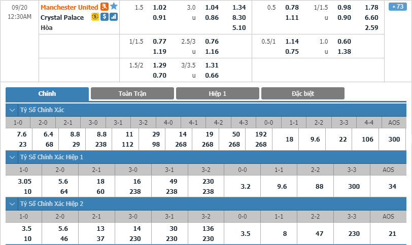 - Tỷ lệ kèo bóng đá Manchester United vs Crystal Palace