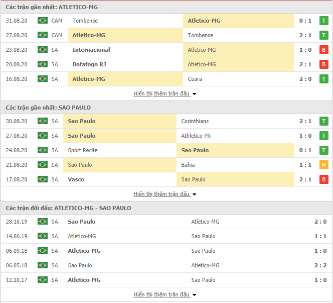 Thống kê phong độ & Lịch sử đối đầu Atletico-MG vs Sao Paulo