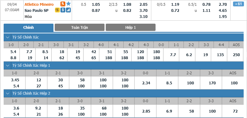 - Tỷ lệ kèo bóng đá Atletico-MG vs Sao Paulo