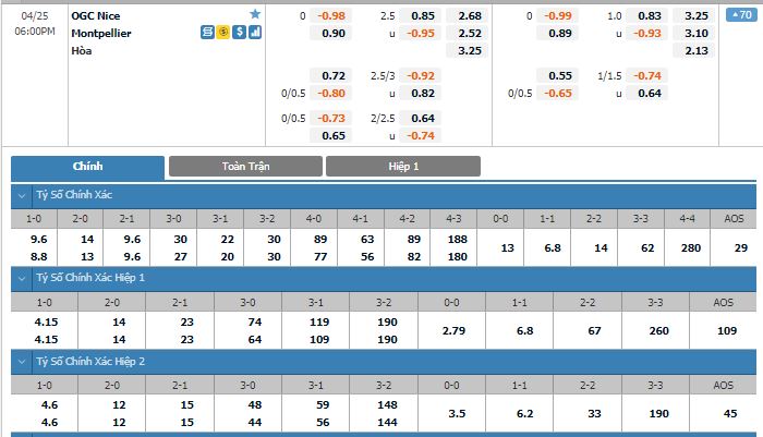 Bảng tỷ lệ kèo trực tuyến trận đấu Nice vs Montpellier: