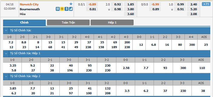 Bảng tỷ lệ kèo trực tuyến trận đấu Norwich vs Bournemouth: