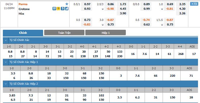 Bảng tỷ lệ kèo trực tuyến trận đấu Parma vs Crotone: