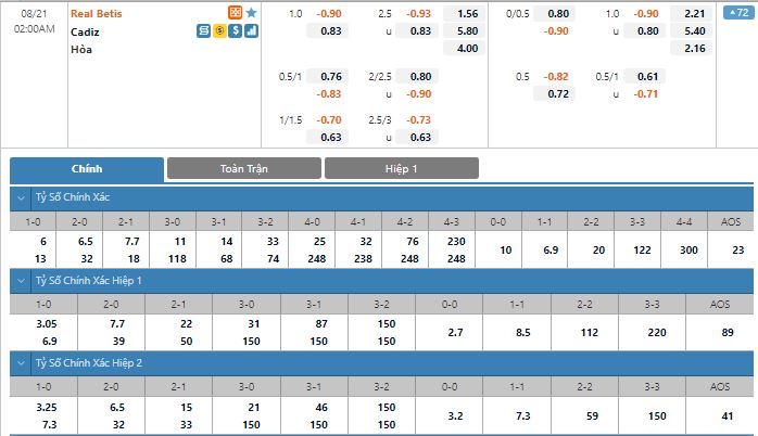 Bảng tỷ lệ kèo trực tuyến trận đấu Real Betis vs Cadiz: