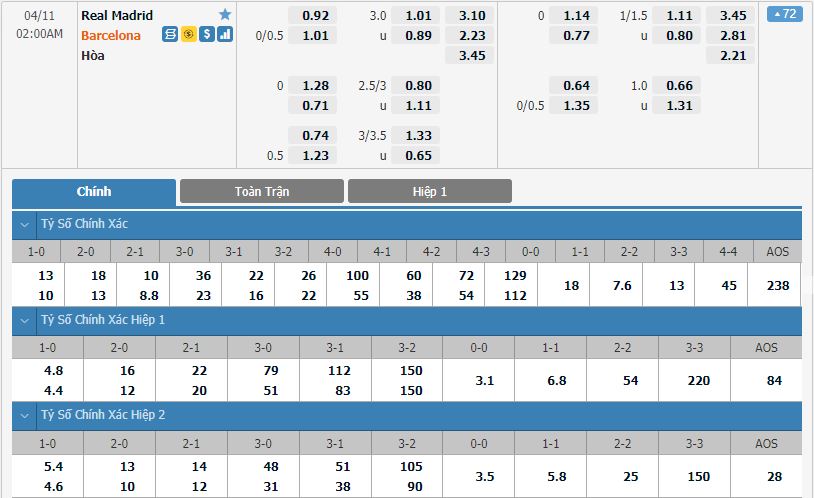 - Kèo tỉ số hiệp 1: Real Madrid 1-0 Barcelona