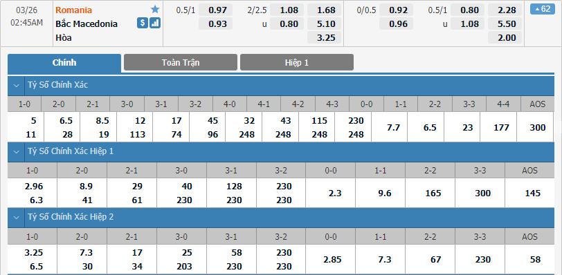 Bảng tỷ lệ kèo bóng đá Romania vs Bắc Macedonia