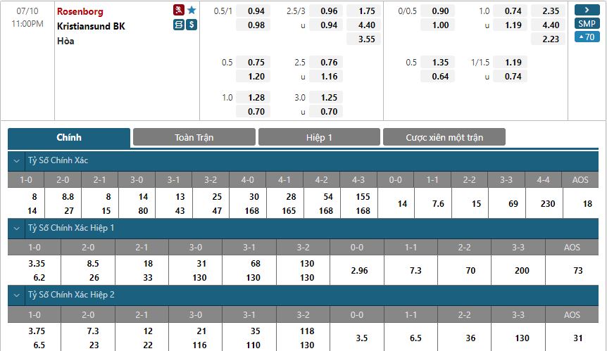 Bảng tỷ lệ kèo trực tuyến trận đấu Rosenborg vs Kristiansund: