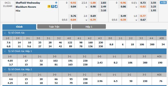 Bảng tỷ lệ kèo trực tuyến trận đấu Sheffield Wednesday vs Blackburn: